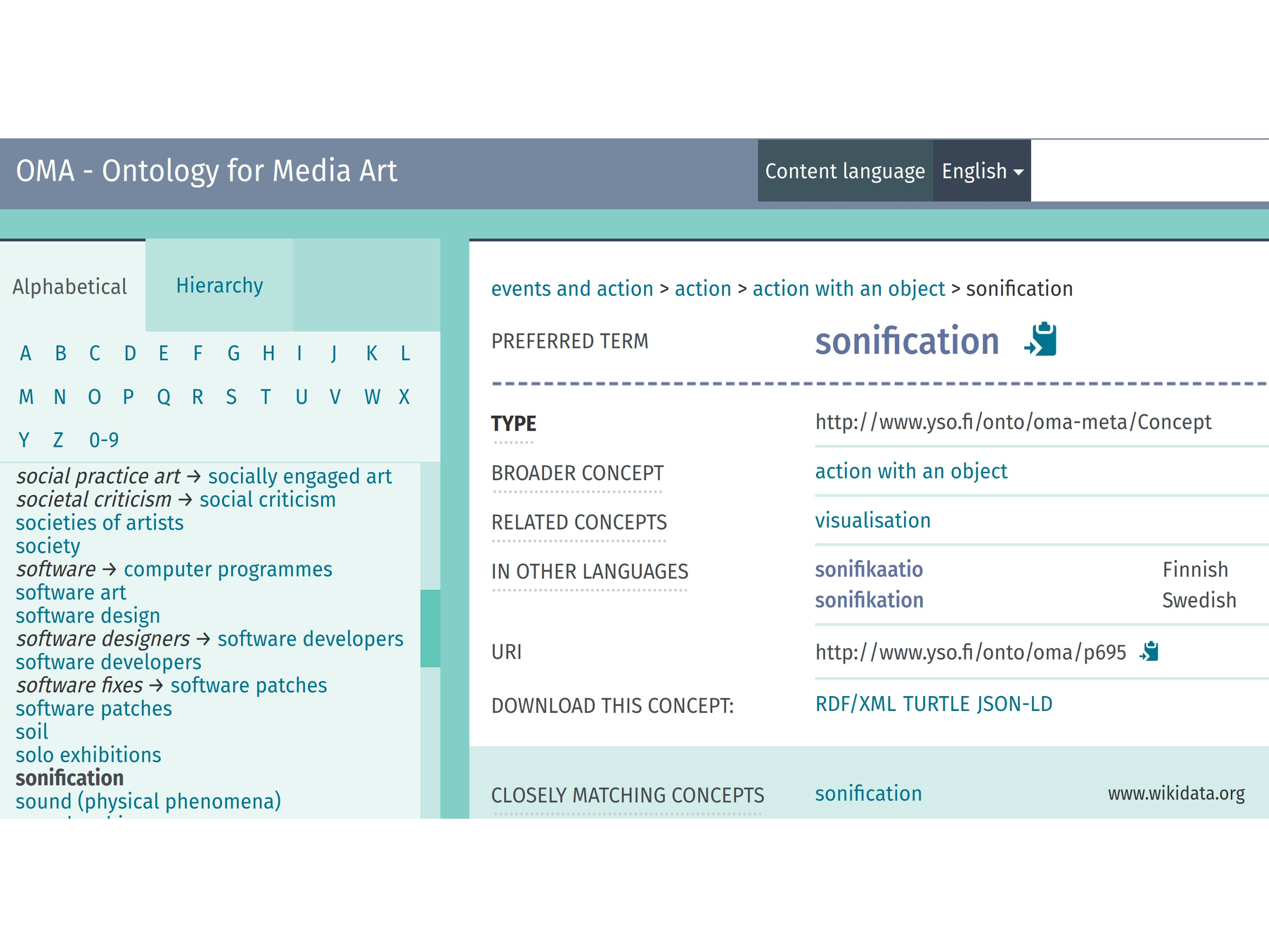 OMA, Ontology for Media Art has been published today at the Finto.fi vocabulary service maintained by the National Library of Finland. With over 1500 concepts to describe the wide field of media arts, ranging from video, sound, light art, experimental film and music to new forms of digital literature and AI based art, OMA is one of the most comprehensive terminology resources dedicated to media art. Concepts from the tri-lingual (fi,sv,en) ontology have also been added and linked to wikidata.